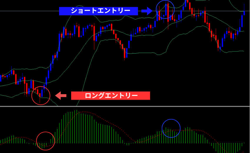 • ロング:価格が下限バンド接触+MACDがシグナル上抜け(GC)