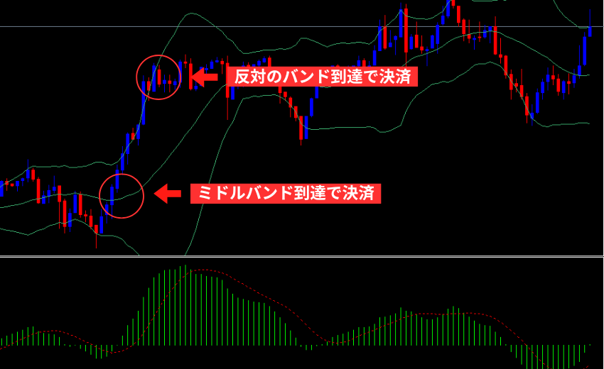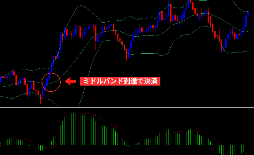 • 利確:ミドルバンド到達、または反対側バンドの手前で分割利確