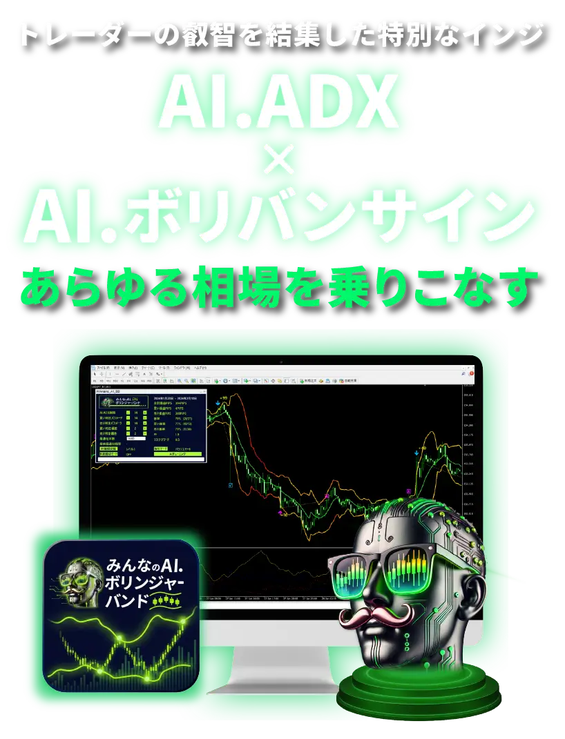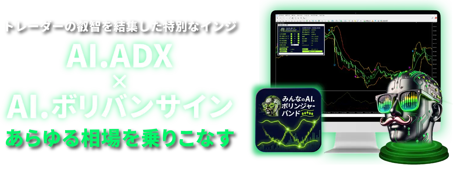 トレンドもレンジも、あらゆる相場を乗りこなす!トレーダーの叡智を結集して開発したAIボリバンサイン。ロジックにAI.ADXを使用することで、相場の本質的な強さをサインに反映。