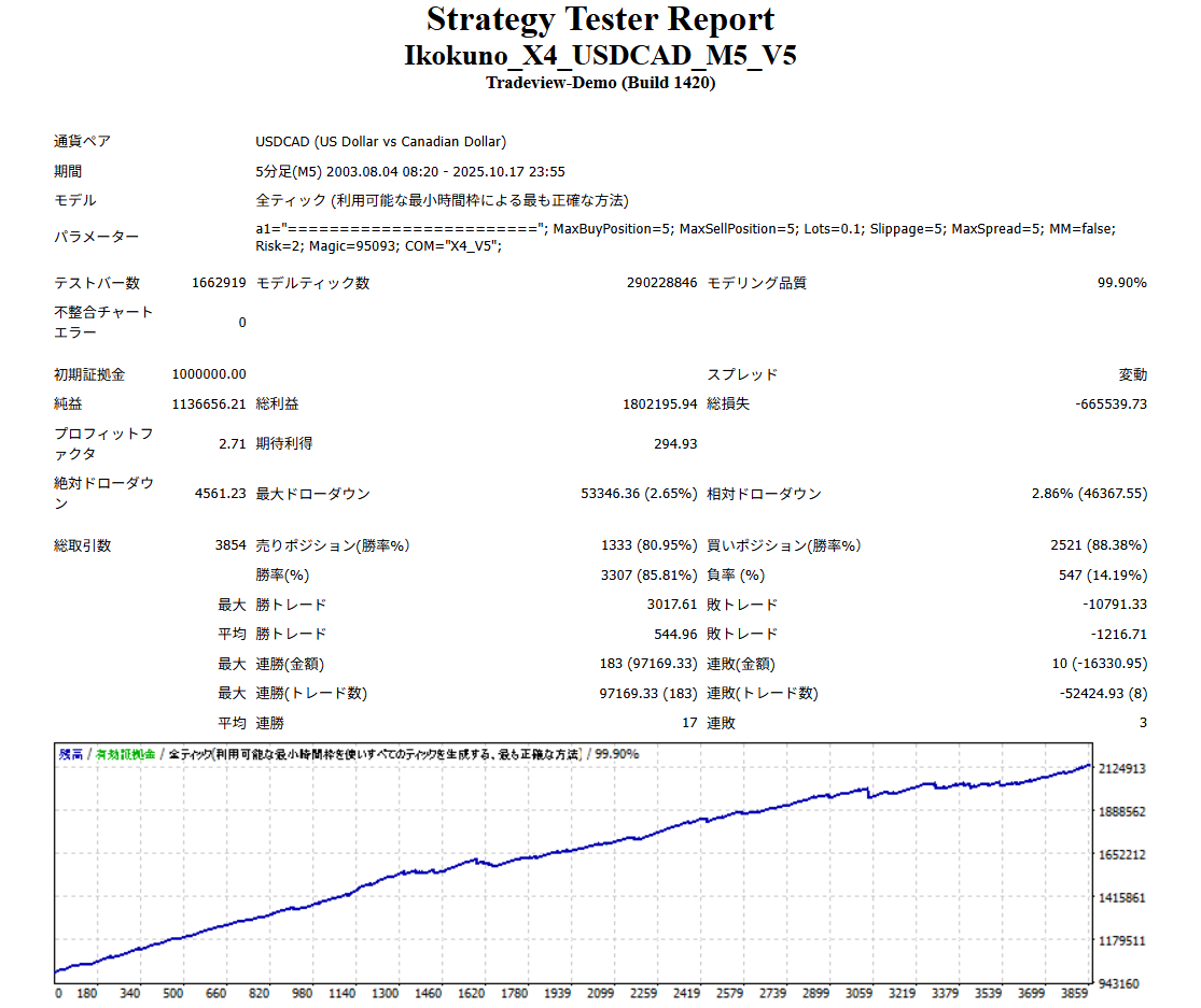 複利機能でリスクを上げる、または証拠金に対して大きすぎるロット数を設定することで少しの値動きだけで破綻(強制ロスカット)する可能性があります。本EAは勝率が100%ではなくバックテストにおいても、特定の期間を抽出すると負け越す部分があるため、ロット数を抑え長期的な運用を前提として稼働していただくことを推奨しております。