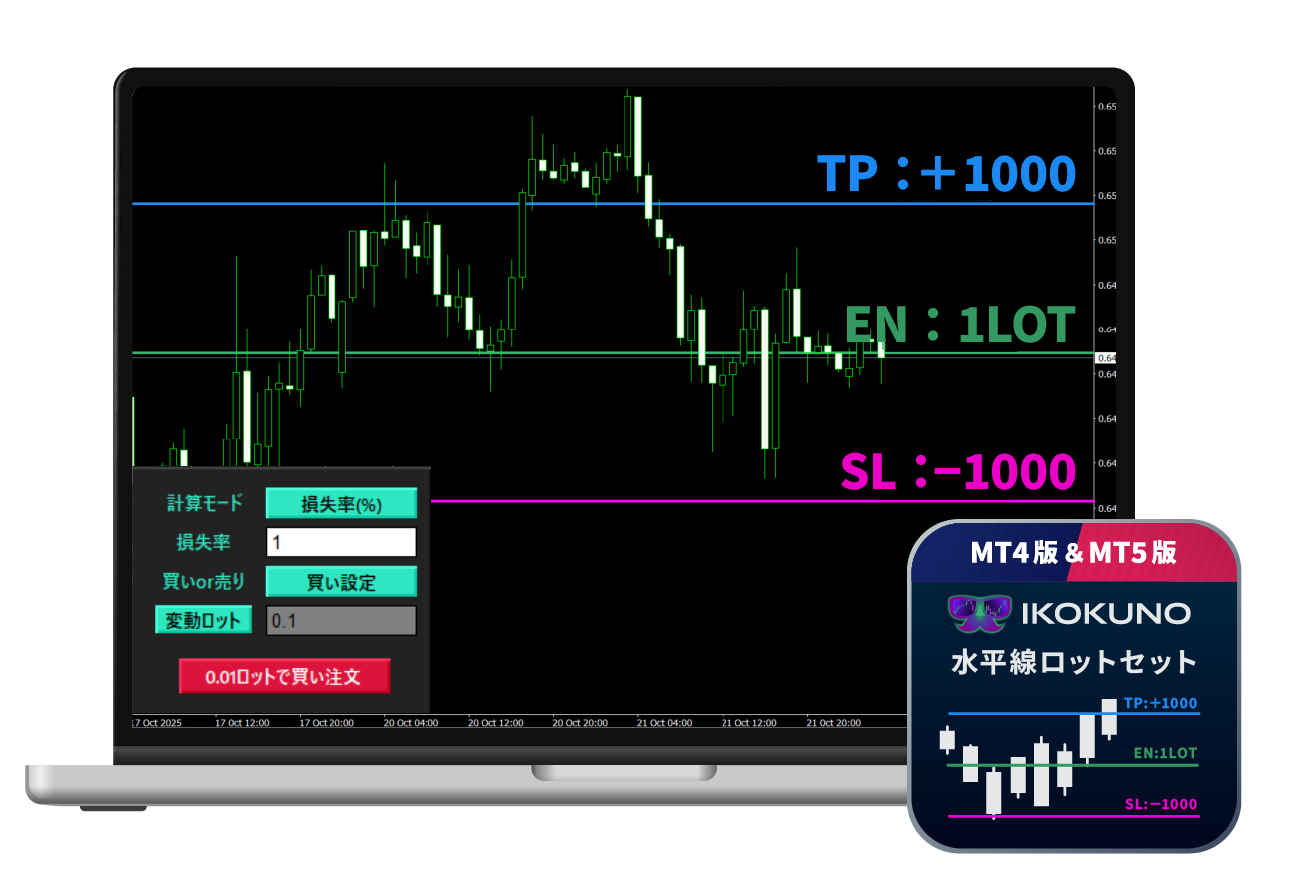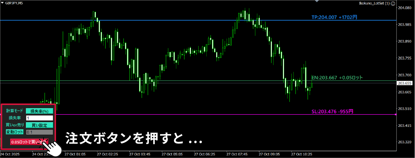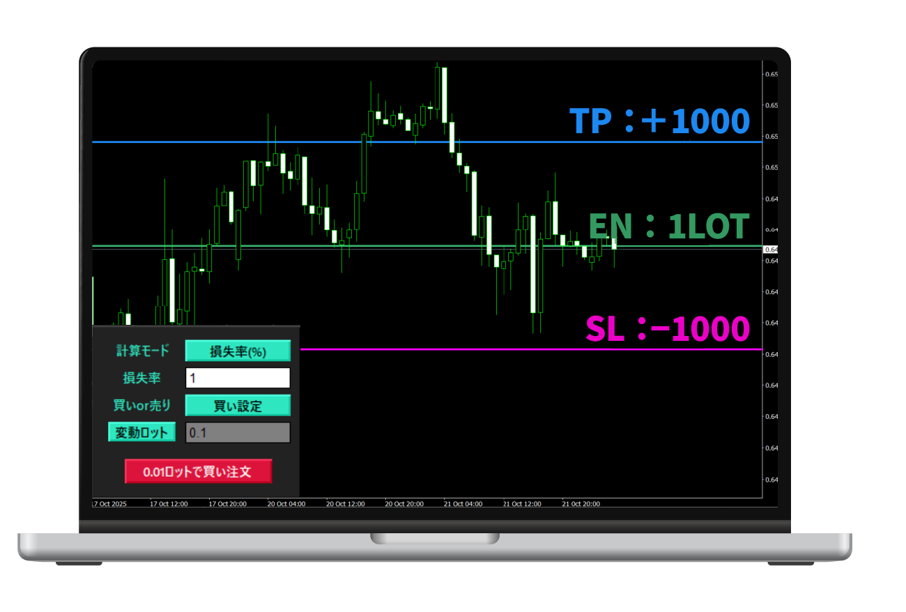 水平線を動かすだけで、許容損失からロット計算!決済指値も自動設定。