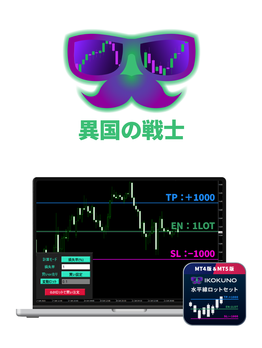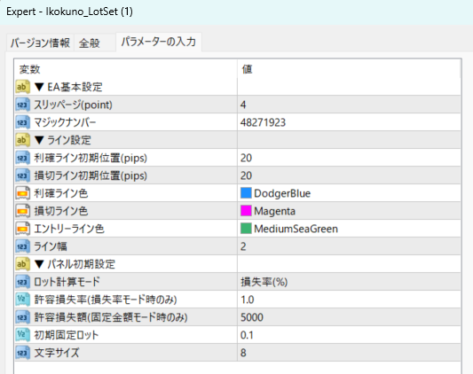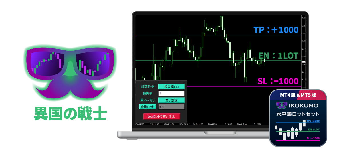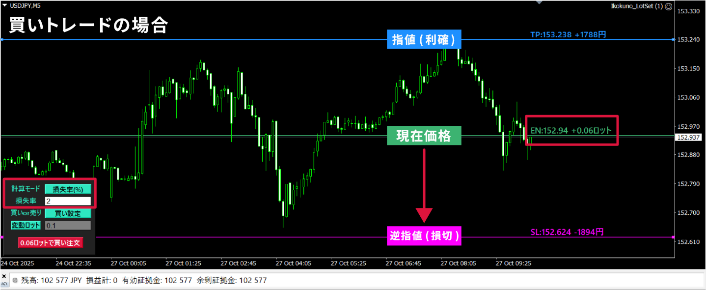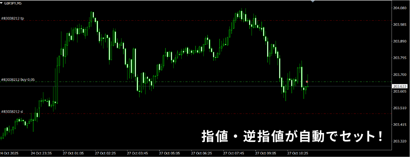 水平線を動かすだけで、許容損失からロット計算!決済指値も自動設定。