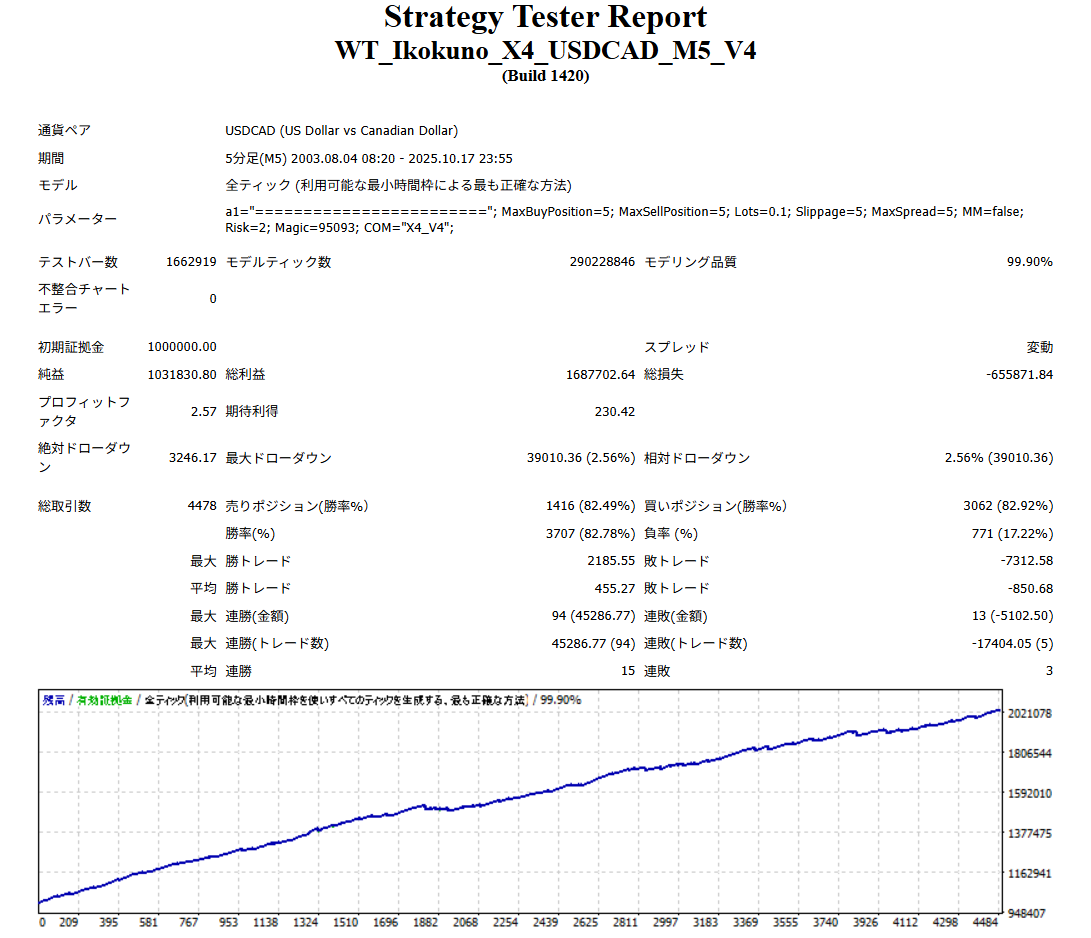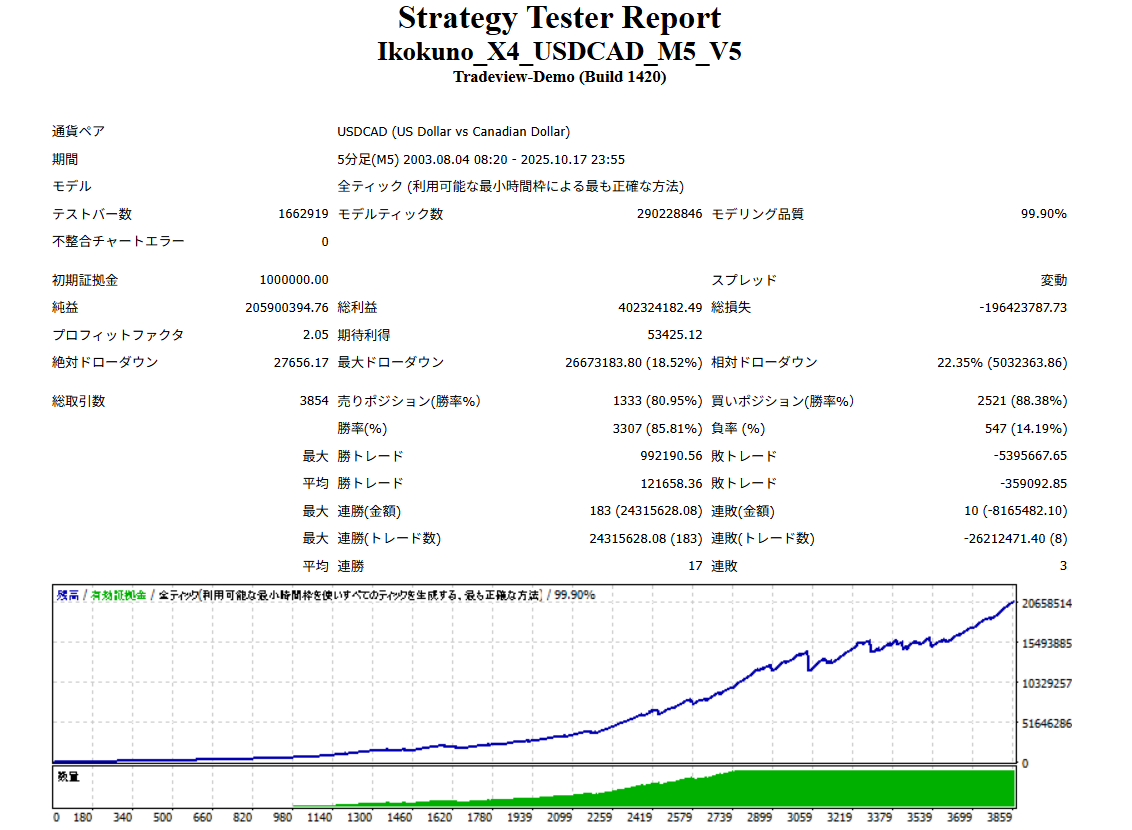 異国のX4は、長期間の検証においてPF2.71という安定した収益性を記録。単なる勝率依存ではなく、トータルバランスに優れた堅実なロジックが、この高水準を支えています。高精度モデル品質(99.9%)でのテストで実現された、信頼できる数値です。