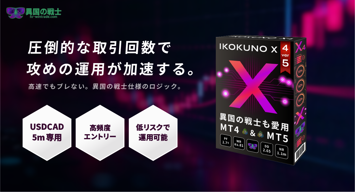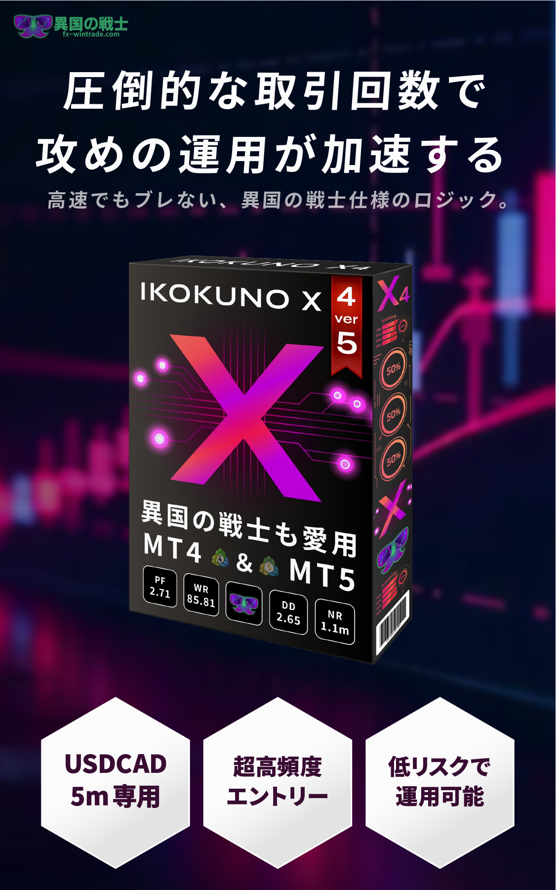【異国のX4】は、米ドル/カナダドル特化の異国の戦士も運用しているMT4/MT5用EA(自動売買プログラム)です。珍しい通貨ペアのドルカナダ(USDCAD)は、値動きの傾向が他通貨と異なるため、他EAとの相性もよく、ポートフォリオ運用に最適!バックテスト結果はもちろん、プロフィットファクター2.71、取引回数3,854回、勝率85.81%、最大ドローダウン2.65%と好成績を維持している貴重なEAです。