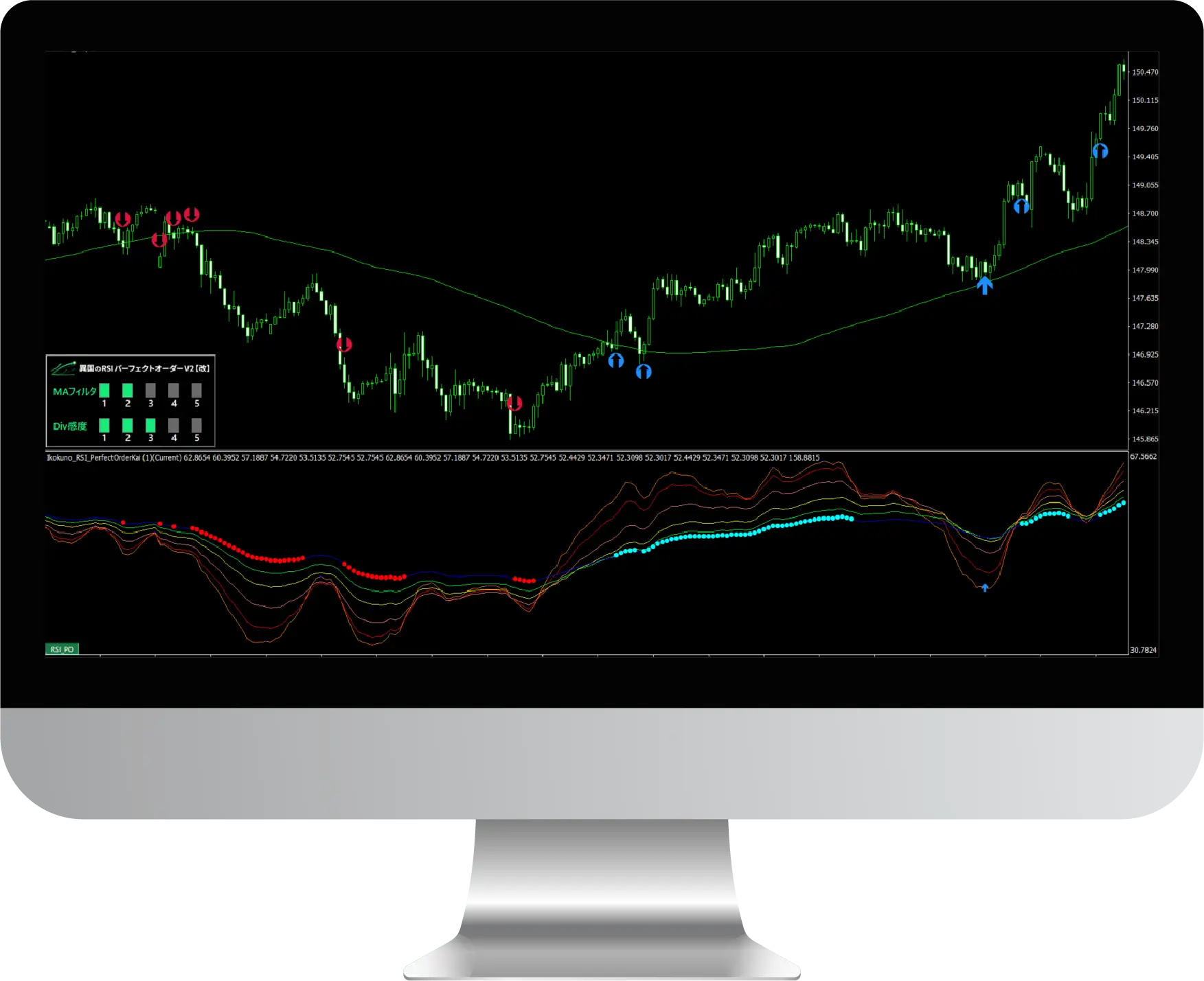 「RSIパーフェクトオーダー」と「ダイバージェンス」の2つのサインに対し、新たにMAフィルターを搭載しました。これにより、トレンドに合わせた高精度なサインのみを厳選して抽出することが可能です。