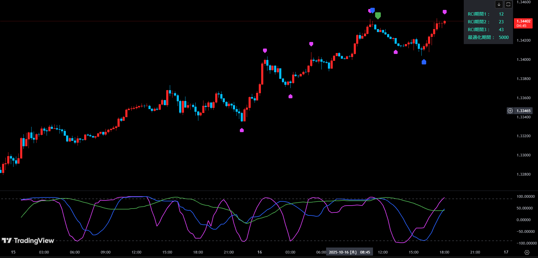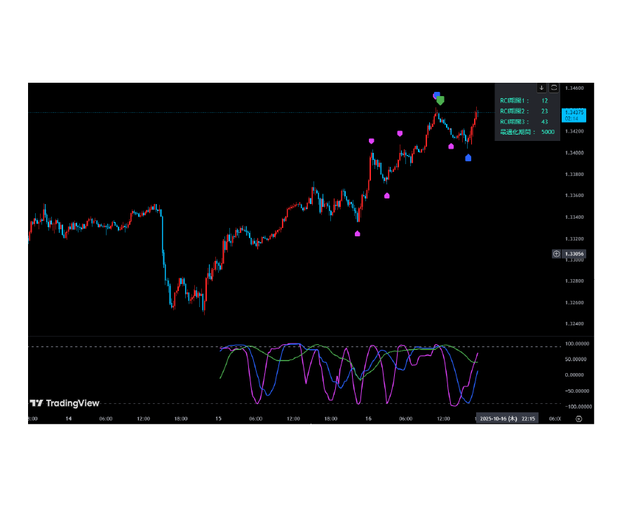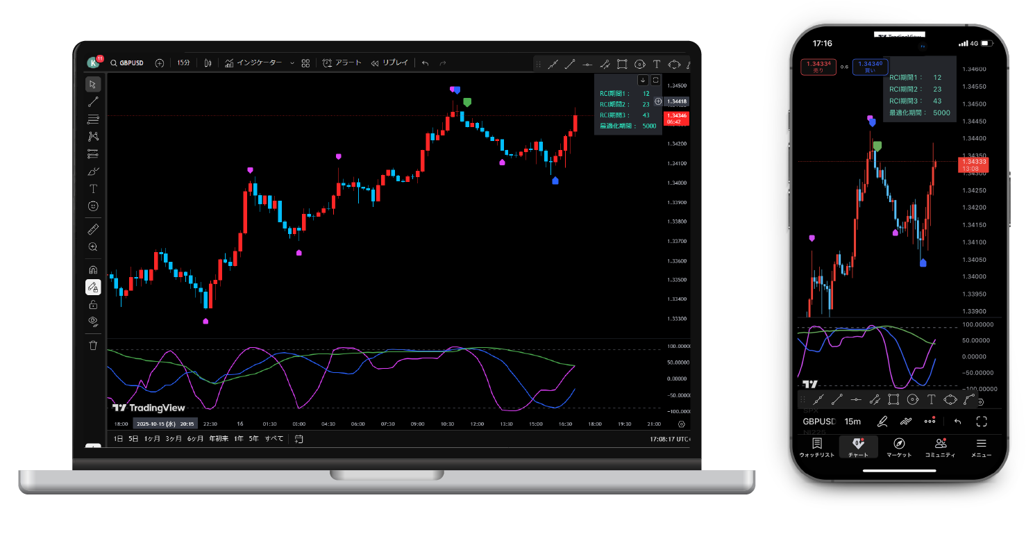 RSIが値動きに対して比較的なめらかに推移するのに対し、RCIは一方向の相場では+100や-100に張り付きやすく、強いトレンドの継続や行き過ぎをより明確に映し出すのが特徴です。